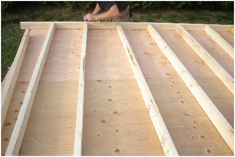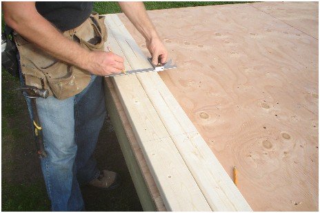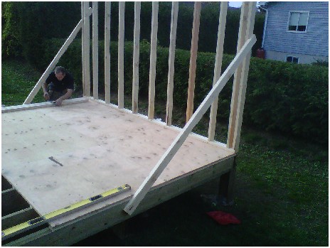 Above you will see a picture of the deck frame with plywood installed. This will be the actual floor of the shed. The exposed framing in front of the floor will be the porch outside the shed and will be covered with pressure-treated 5/4 deck boards to be more weather resistant than ply wood. You will also notice that we raised the plywood above the joists by 3/4 inches to bring the shed floor about 1/4 inch above the deck surface outside. To do this we simply ripped some strips of 3/4 inch plywood and tacked them to the top of the joists. Unless you are planning a front landing or porch you might not have to worry about this when you build your own shed.