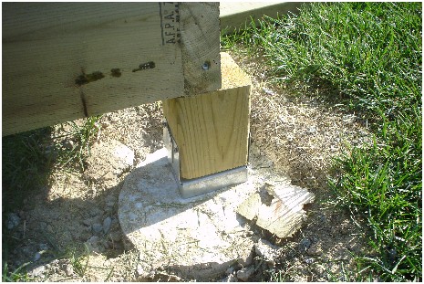 It's then a simple matter to measure down from the underside of the floor deck frame to the top of the footing cleat to determine the length of the post needed at each footing. Here you see the support post in place after removal of the temporary support. The post juts out from the front of the frame, but the second plate will rest on that when attached. The second plate has not yet been added to the front and the back as we still have to install the remainder of the joists and we won't have to use joist hangers if we attach them by screwing directly through the front and back plate. A double plate would be 3 inches thick and our screws would be too short to attach the joists. Doing it this way also keeps the frame light enough to move around and adjust easily. If you build your own shed on level ground you may only need a few shims on top of the footings to level out the frame.