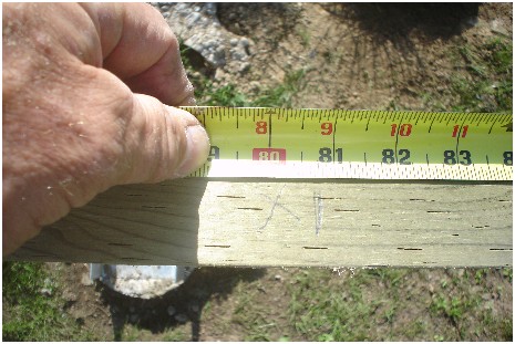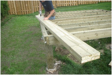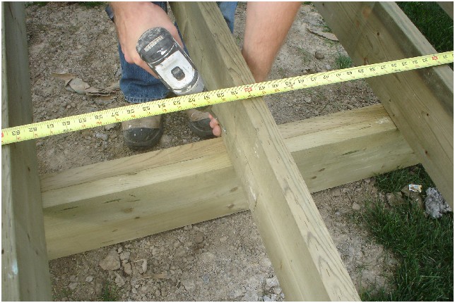 John is measuring the diagonal line to a point on the double rim joist from the far corner to square up the frame. We use a little high school math (Pythagorean Theorum) to mark and square the frame. When it is square, a board is screwed onto the frame on a diagonal to hold it square so we can move it into place over the footings. We double checked the 'squareness" of the frame by measuring the diagonals, tip to tip, and as the measurements where the same, we knew it was square. When you build your own shed on level ground, you might be able to build the deck frame complete, right on the foundation.