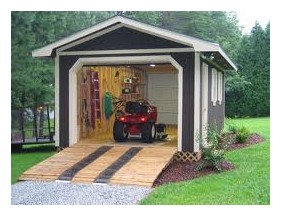 Firstly, Sharon wants the shed to store a lawn tractor at one end and the other end will be used for gardening tools, work bench and other storage. She is an avid gardener and will be doing some potting in the shed. She also wants to use the roof rafters for storage and asked that we keep it as open as possible for this purpose. She wants lighting inside and electrical outlets both inside and out. Windows are required in the front on either side of the double doors and as the shed will be built on a sloped area of the lawn, there is to be a skirt all around it to prevent critters from making a home beneath. This shed will also come complete with vinyl board and batten siding, soffit, fascia eavestroughing (gutters) and a front deck and tractor ramp. As I said, this will be no plain-Jane shed.